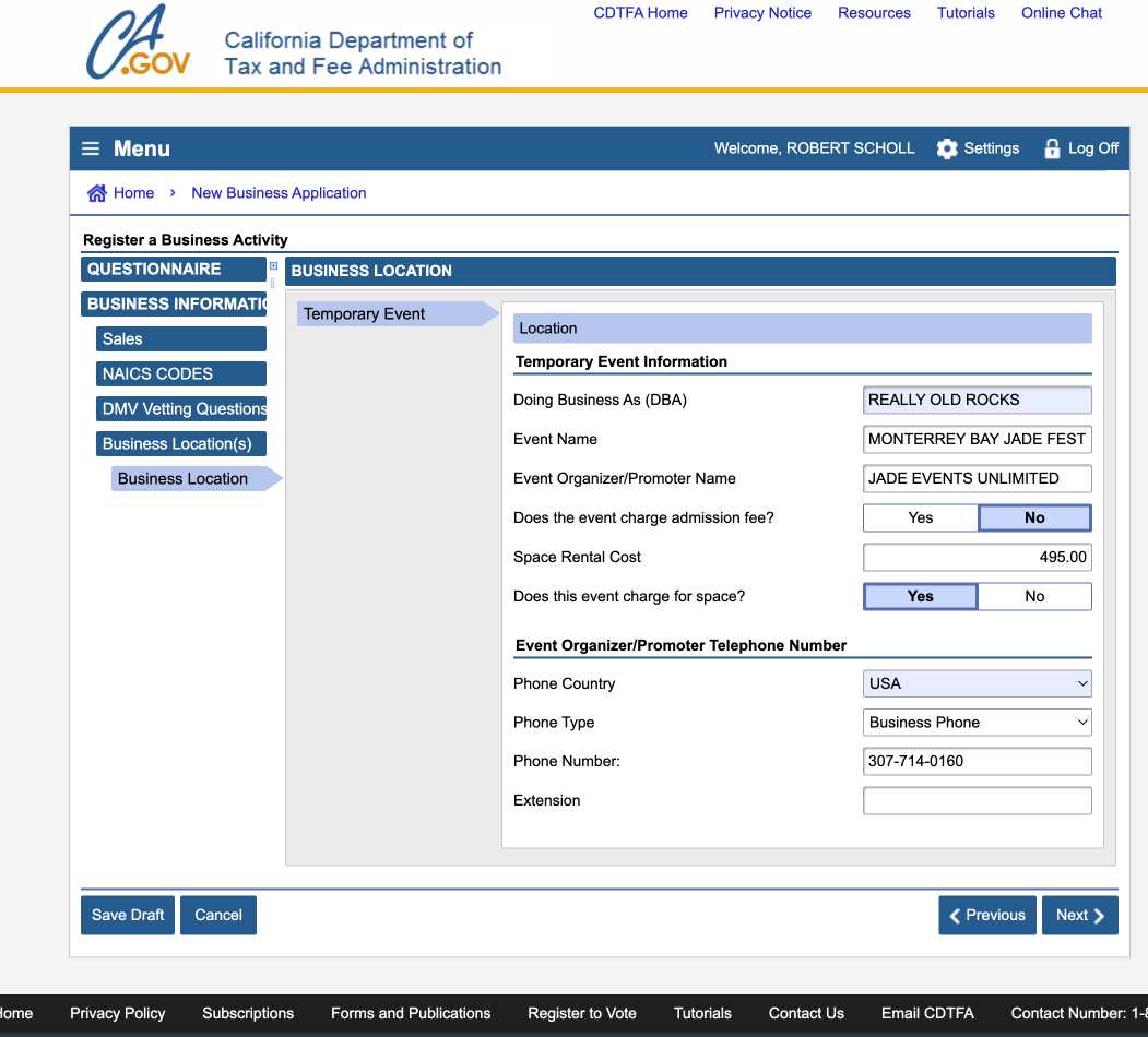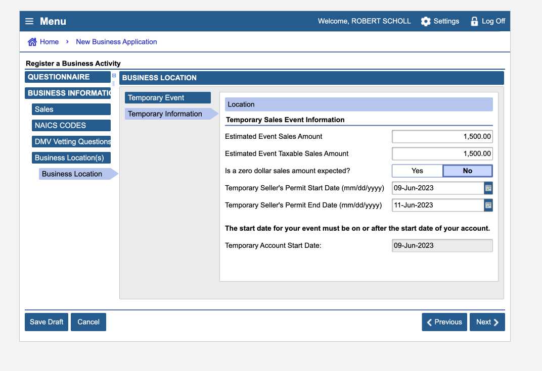 Log in and start the process for a new permit using the link for “Register a new business acivity” If you get bogged down don’t get frustrated just call 1-800-400-7115 for help